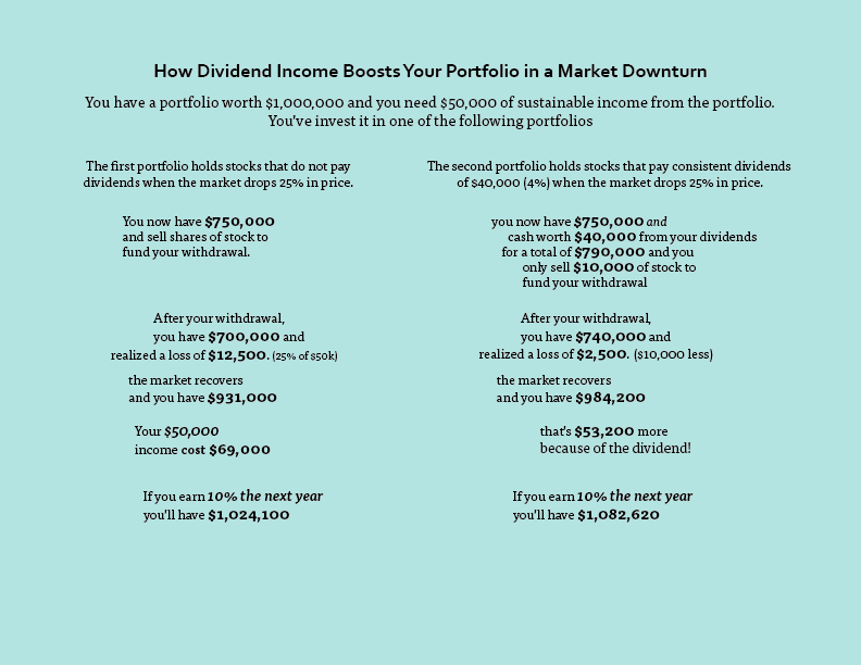 Let’s start with examining the income stream in a bit more detail. Dividend payments on equity investments are generally expressed as a percentage of the current value of the share of stock, however, they are actually a set dollar amount established by the Board of Directors of the corporation and are generally paid out quarterly or semi-annually. The Board of Directors will typically evaluate the dividend on an annual basis, so it does not change with fluctuations in the market. We look for companies who have a long history of regularly increasing their dividend and have the available cash flow to continue doing so. This means that dividend payments continue to come into your investment account (or personal checking account if you so choose), even when the market is in a slump, providing stability to your cash flows.[2] Investments selected for their financial strength and dividend-paying consistency typically do not decrease their dividends in turbulent times (they often increase their payout). The other advantage of a diversified dividend-paying portfolio is that it provides a rising stream of income which is more resistant to inflation than most other methods of generating investment income and does not require you to actively increase a tenant’s rent.