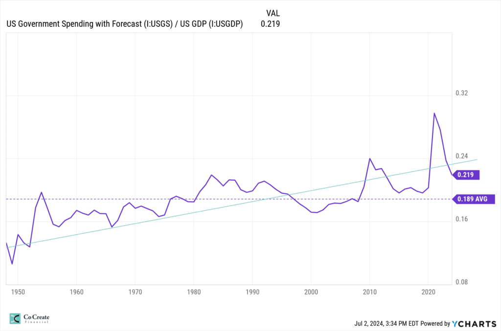 Government spending as a percentage of GDP isn’t as much through the roof as it might seem when we compare it to historical norms, but it's too high for a healthy and growing economy. This is especially true with the current level of debt. Republicans and Democrats alike stand on platforms to expand spending. Regardless of what each of us deems worthy of government funding, those funds need to be in balance with the overall productivity of our country. GDP is the total value of goods and services the US produces (consumer spending, government spending, investment, and net exports). If we imagine a scenario in which Government spending accounted for 100% of GDP, where would they get their revenue? In this hyperbole, there are no businesses or personal revenues to tax (taxable revenues begin with business investment and consumers spending on their product)