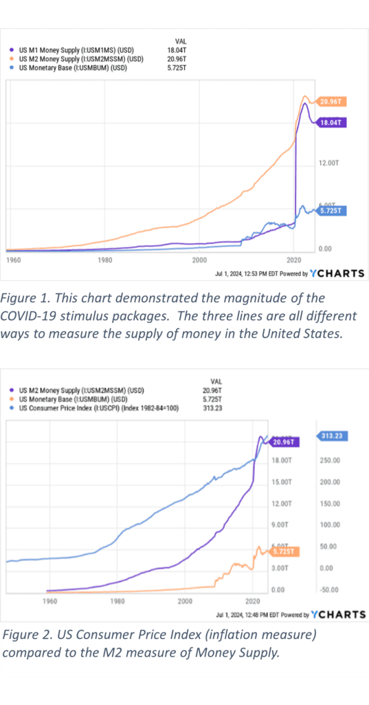 Simply put, inflation is the effect of supply and demand for the dollar. Just like the price of a carton of eggs or a used car changes depending on whether they are hard to find on a shelf or if the dealer can’t seem to move them off the lot, the dollar has more or less purchasing power if there is an abundant supply or if is scarcer in relation to goods and consumers. Policies that are effective at combating the inflationary riptide of a surging money supply will either claw back such supply, limit its future growth or distribute it among a higher number of productive citizens.