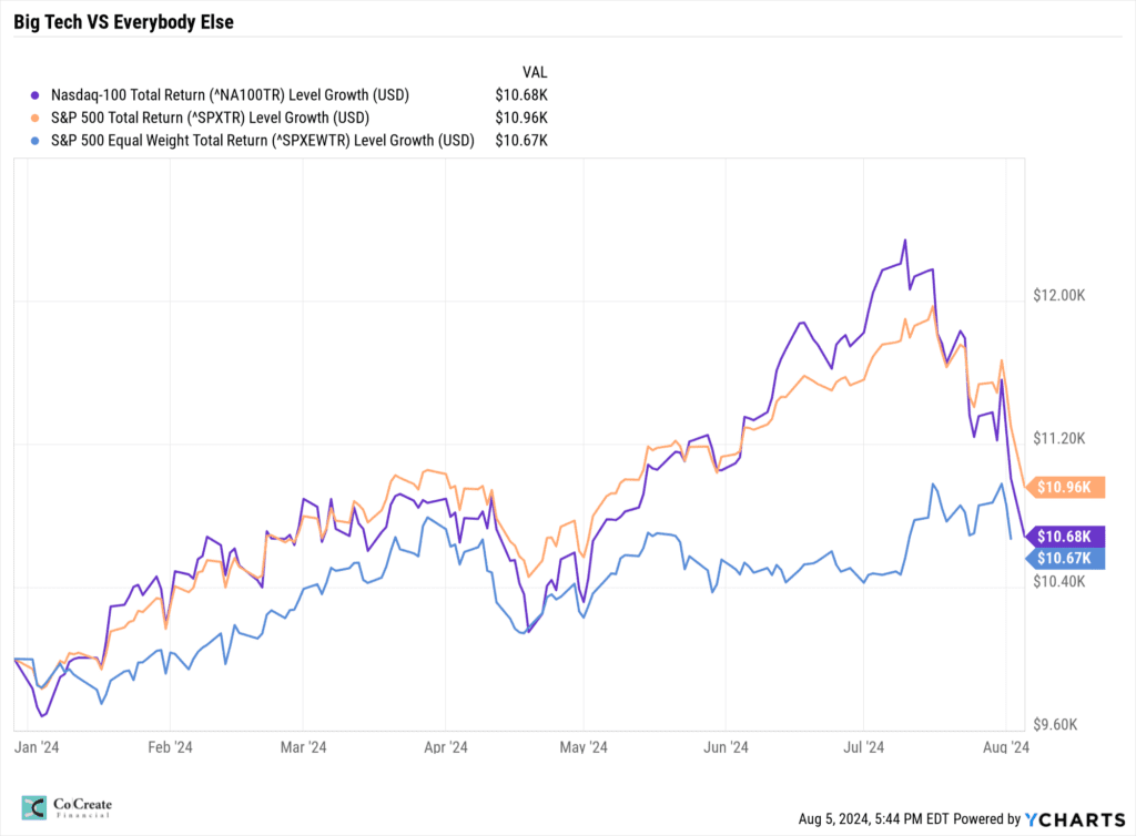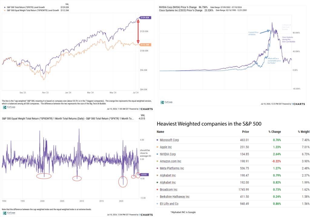 Here are two sets of charts that we feel do a great job of explaining what is happening in the stock markets over the past few weeks. The first is one that we created about a month ago that illustrates the tech bubble on July 10th. The second chart shows three different stock market averages, the Nasdaq 100 (about 60% technology), the S&P 500 (about 40% technology and heavily weighted in just a few companies), and the S&P 500 equal weight index, which gives an equal representation to each of the 500 largest companies in America. These three charts illustrate the tech bubble burst We believe the S&P 500 is a terrible representation of the overall stock market and when it is used in a portfolio as an investment (in a fund), it's actually a high-risk "momentum" investment. Because the Nasdaq 100 is even more heavily concentrated in Big Tech companies than the S&P 500 index, when we look at the two side by side it illustrates the impact the technology sector has on what most people call the stock market (the S&P 500).